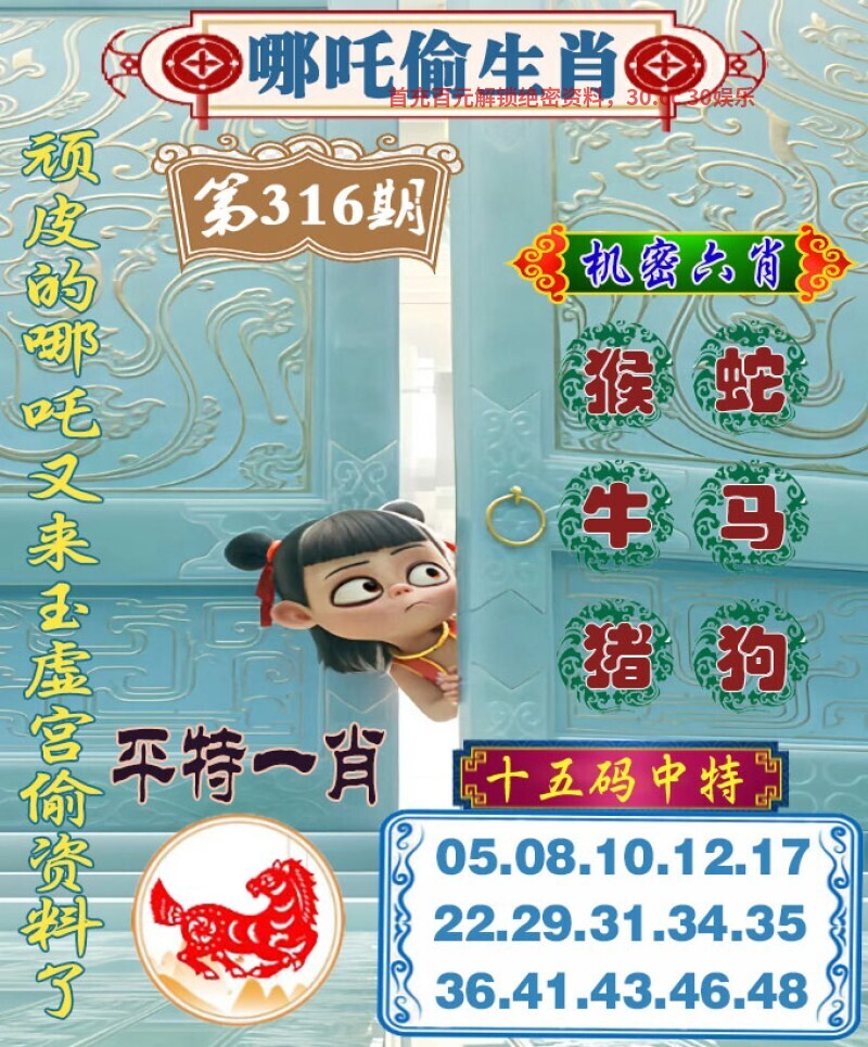 | 316期【解哪吒偷生肖】 解料:我佛造经传极乐,观音奉旨上长安 机密六肖:猴蛇牛马猪狗 平特一肖:马马马 |